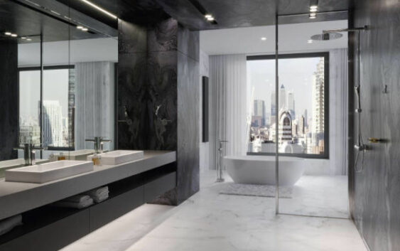 Kwintesencja nowoczesnego luksusu, w którym łączą się eleganckie marmurowe płytki i lustrzane powierzchnie. Minimalistyczne linie wyposażenia i wysokiej jakości materiały tworzą harmonijną i wyrafinowaną przestrzeń, idealną dla miłośników współczesnego designu. Chromowana armatura doskonale komponuje się z tym stylem. Ich połyskująca powierzchnia dodaje szyku i odbija światło, potęgując wrażenie przestronności. W strefie umywalki znalazły się baterie z kolekcji Algeo Square, które wyróżniają proste, wyraziste kształty. Idealnie wpisują się w minimalistyczny, elegancki charakter tej łazienki. Z kolei stojąca bateria wannowa Fiesta, swoim nowoczesnym designem i chromowanym wykończeniem, podkreśla luksusowy wygląd przestrzeni kąpielowej, tworząc spójną i stylową całość.