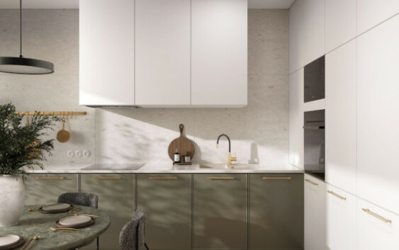 Subtelne kolory i starannie dobrane detale kuchni tworzą spójną, elegancką kompozycję, gdzie każdy element pełni określoną funkcję. Rozkład mebli oparty na prostych liniach jest lekki i uporządkowany w odbiorze. Dolne fronty w odcieniu szałwiowym wprowadzają spokój i naturalny klimat, a jednocześnie wyróżniają się obok białych, wiszących modułów oraz wysokiej zabudowy skrywającej ogrom miejsca do przechowywania. Zastosowanie gładkich powierzchni na wyższych partiach podkreśla wysokość pomieszczenia i pozwala wizualnie odciążyć strefę roboczą. Organizacja przestrzeni jest logiczna i ergonomiczna. Blat zapewnia sporo miejsca do pracy, ze zlewozmywakiem i płytą grzewczą w centrum, a sprzęty AGD zostały umieszczone w słupku w taki sposób, aby zapewnić wygodny dostęp. Równoległe linie i rytm pionowych podziałów buduje poczucie ładu. Funkcjonalny i przyjazny układ gwarantuje swobodę ruchów podczas gotowania i przygotowywania posiłków.